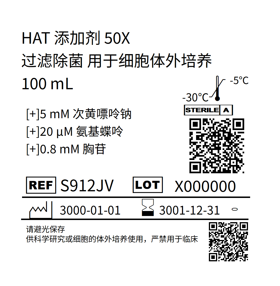 HAT Supplement (50X) is a liquid mixture of sodium hypoxanthine, aminopterin and thymidine. HAT-supplemented medium is suitable for post-fusion selection against unfused or self-fused HGPRT–myeloma cells. Hypoxanthine and thymidine supply preformed purines and pyrimidines for DNA synthesis by hybridomas via the salvage pathway that utilizes HGPRT- contributed by the fused spleen cell. Aminopterin, a folic acid antagonist, inhibits the de novo nucleoside biosynthesis pathway.