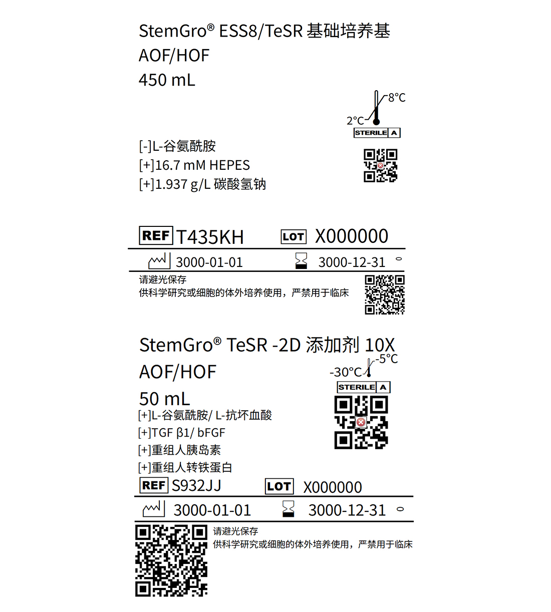 StemGro® TeSR多能干细胞培养基是专为人类多能干细胞(hPSC)和胚胎干细胞(hESC)的生长和扩增而设计的化学成分明确的无血清培养基。该培养基由StemGro® ESS8/TeSR基础培养基和StemGro® TeSR-2D添加剂两个组分组成,添加剂中含有重组人碱性成纤维细胞生长因子(rh bFGF)和重组人转化生长因子(rh TGFβ),无需再添加其他生长因子。由于添加了长效细胞因子,一次补液可维持48小时以上,培养方式灵活,周末无需加班换液。