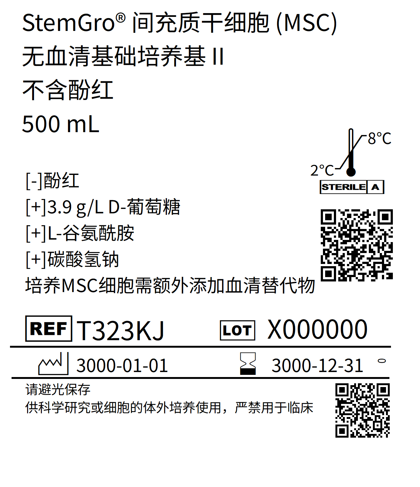 StemGro® 间充质干细胞(MSC)无血清基础培养基II是专为人类间充质干细胞(包括脐带间充质、骨髓间充质、脂肪间充质、脐带血间充质等干细胞)设计的基础培养基。该培养基为基础配方,需添加一定比例的人血小板裂解物(PLT),制备成完全培养基后使用。在干细胞分离过程中,当细胞贴壁率达到 75 ~85 % 后,可使用配置好的间充质干细胞(MSC)无血清完全培养基进行传代。与传统的须添加动物血清的培养基相比,配合PLT使用的StemGro®间充质干细胞(MSC)无血清基础培养基能维持间充质干细胞的无分化生长,保持细胞的形态特征和正常的染色体核型等,保证间充质干细胞的高增殖率以及分化潜能,并排除了培养过程中混入异源物质(来自于人类以外的其他动物物种的成分)的可能性。
