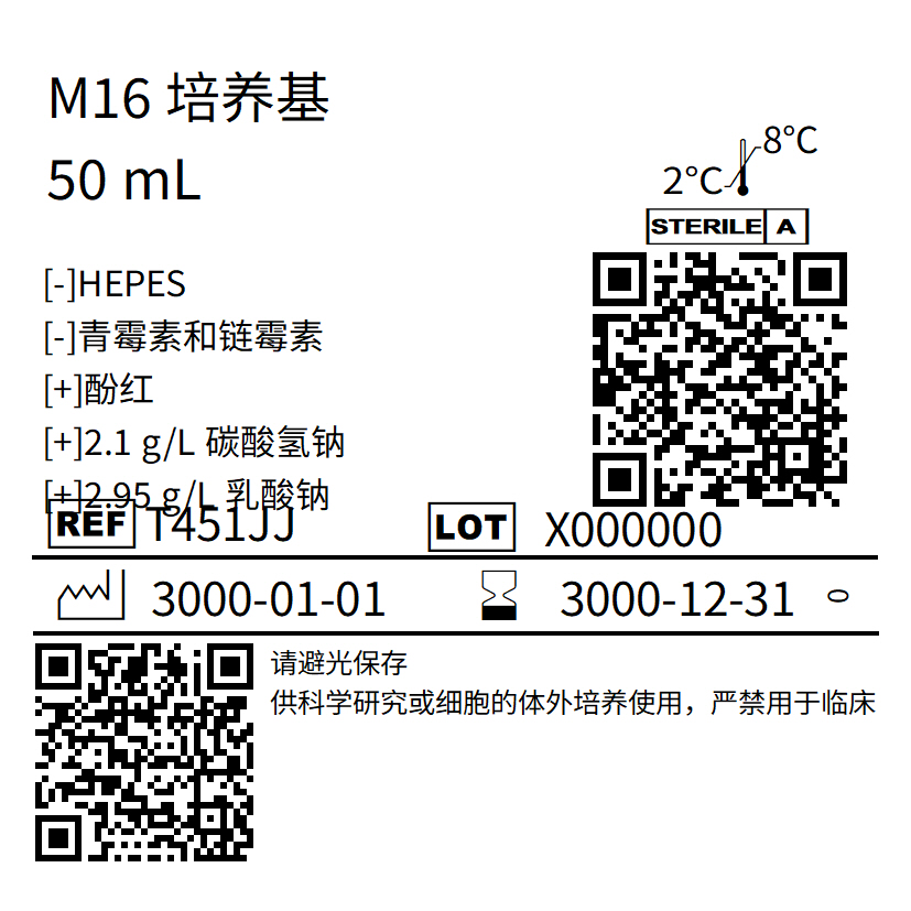 M16含有丙酮酸和乳酸作为能量来源,因为植入前小鼠胚胎不能有效利用葡萄糖。M2培养基是对M16的进一步改良,用HEPES缓冲液替代部分碳酸氢盐。M2可用于在大气环境下长时间收集和处理胚胎。