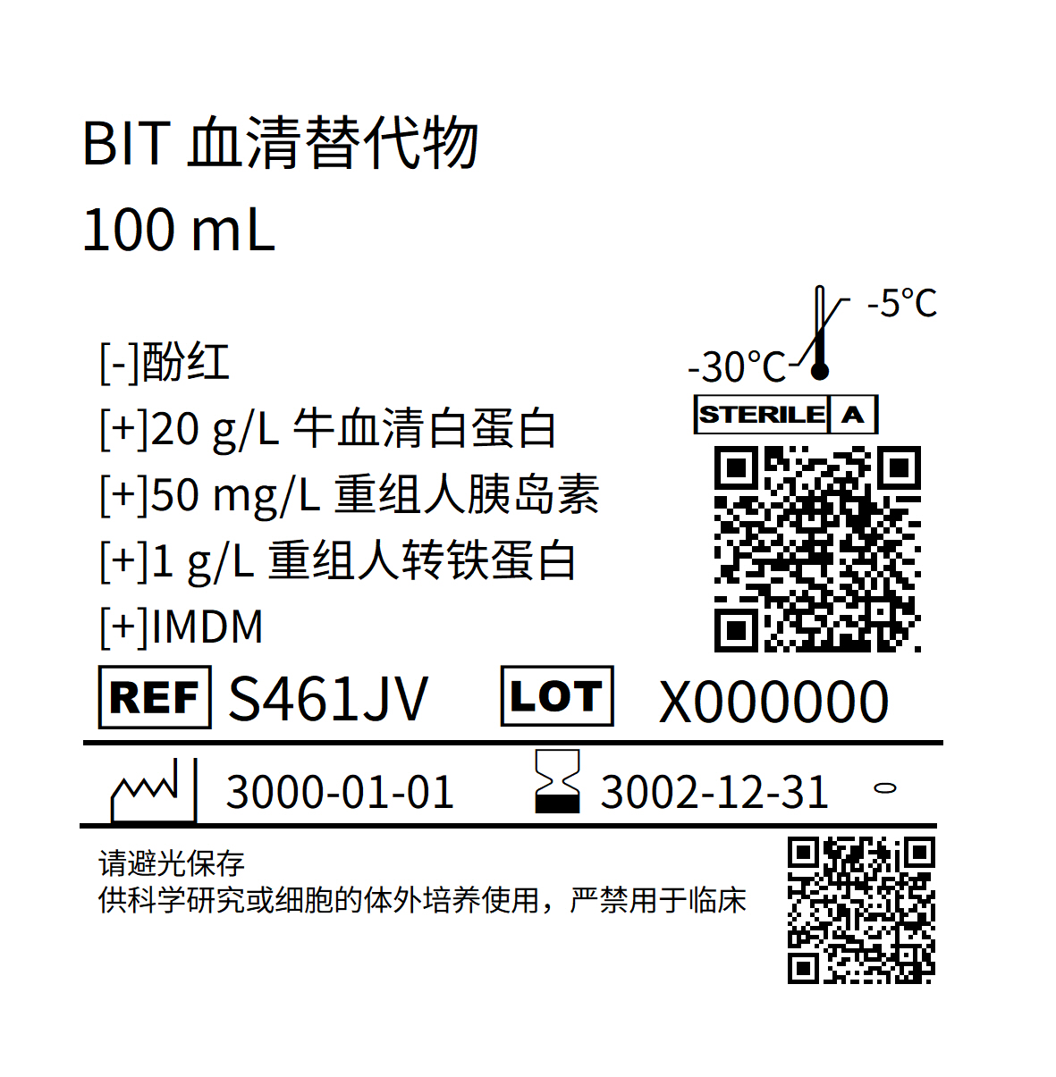 BIT血清替代物是牛血清白蛋白、重组人胰岛素和重组人转铁蛋白的混合添加剂,在 IMDM培养基中配制。该添加剂主要用于支持人造血干细胞在无血清培养基配方中的生长。同时也适用于在无血清条件下培养小鼠造血干细胞。源培同时还提供将牛血清白蛋白分别替换成人血清白蛋白和重组人血清白蛋白的同类型添加剂,以供在需要无异源或无动物源的应用场景下使用。