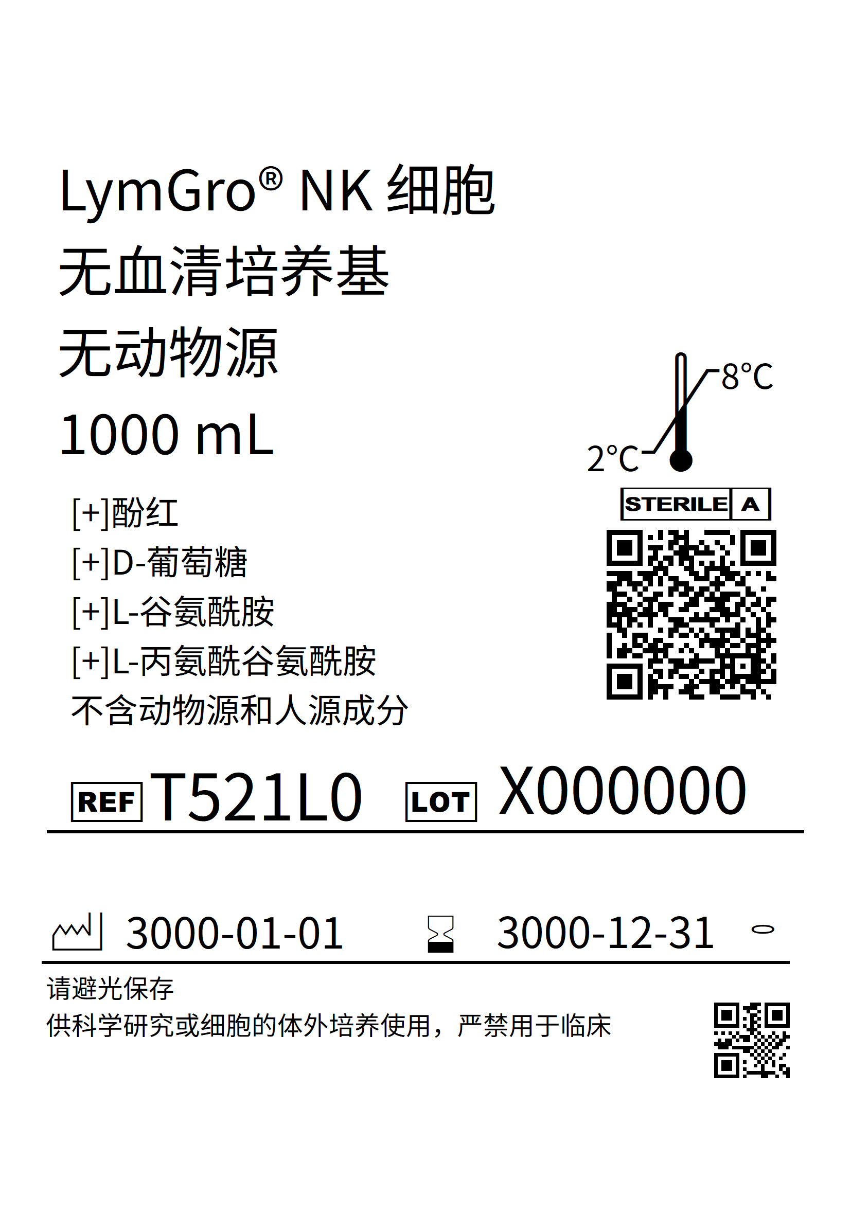 LymGro® NK细胞无血清培养基,专门设计用于从人外周血、脐带血中体外诱导扩增NK细胞。该培养基配方中不含动物源成分,通过添加相应的细胞因子(IL-2、IL-15等)或与滋养层细胞(如如K562-mbIL15)共培养,可高效快速活化及扩增NK细胞。本产品在无血清条件下,已可以得到较好的效果,如有需要,可适当补充自体血浆或AB血清,或可得到更优越的性能表现。