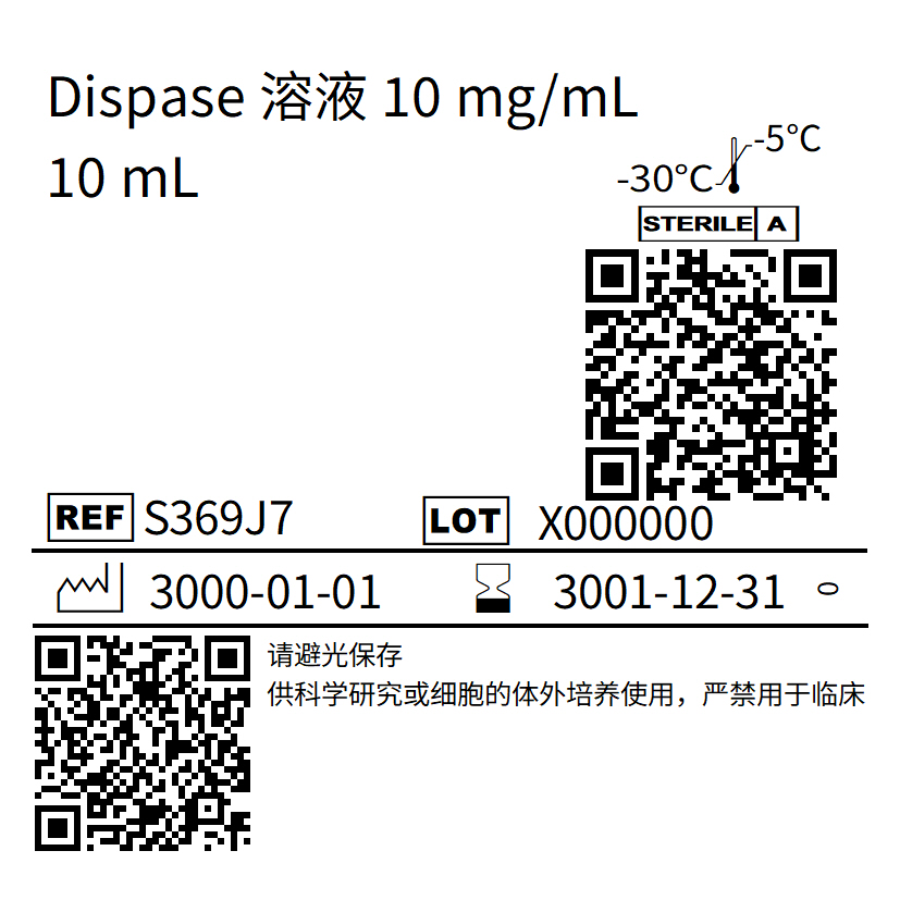 Dispase是一种中性、快速反应、温和的氨基内肽酶,可水解非极性氨基酸残基的N端肽键,该序列常见于胶原蛋白。Dispase具有温和的蛋白水解作用,在生理温度和pH值条件下具有良好的解离能力,通常可维持细胞膜完整性。Dispase可用于原代细胞的分离和常规传代。比如使用Dispase能将表皮从真皮中完整分离,还能将培养的上皮细胞从基质中完整分离出来。其可分裂基底膜区,使上皮细胞保持完整。