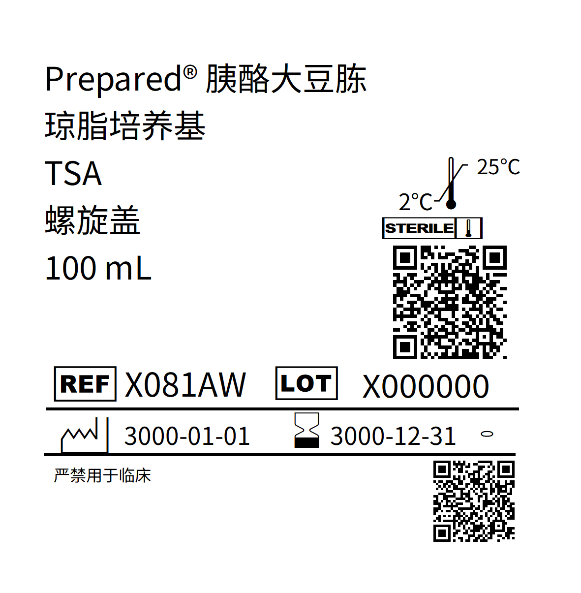 胰酪大豆胨琼脂培养基(Trypticase Soy Agar Medium,TSA)为终端灭菌产品,可放入常温水浴中加热复融,待琼脂培养基完全融化为液体再冷却到合适温度后浇注成平皿,仅供一次性使用。